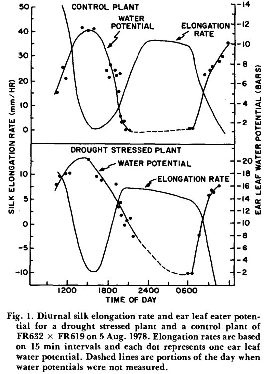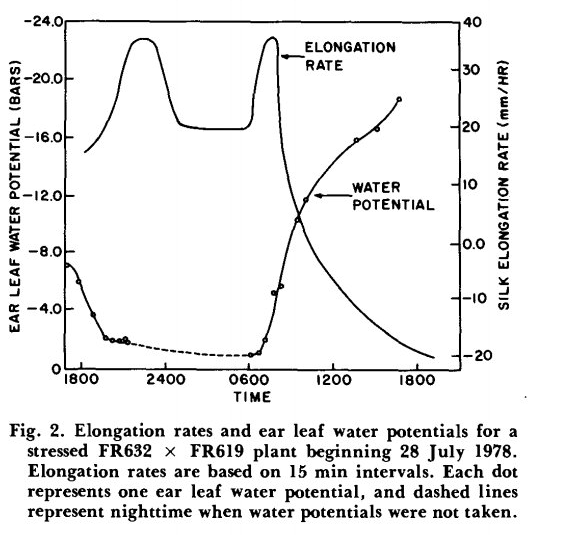 وضعیت روزانه افزایش طول سیلک ها به این دلیل مورد نظر است که مواد استیلار مورد نیاز برای ساخت لوله دانه ی گرده را فراهم می کند. لوله های گرده بین سلول های غلاف سیتوپلاسمی متراکم که آوند سیلک را احاطه کرده اند به سمت پایین حرکت می کند. همانطور که در شکل 1 و 2 می توان اشاره کرد، پتانسیل آب برگ بلال در معرض تغییرات روزانه است، با حداقل پتانسیل آب نزدیک به نیمه بعد از ظهر. این واقعیت که افزایش طول سیلک ها تقریبا در نیمه بعد از ظهر به کمترین میزان رشد طولی خود می رسند، نشان می دهد که طویل شدن سیلک ها تحت تاثیر وضعیت آب گیاه، عمدتاً در شب اتفاق میافتد و گردهها در صبح زود ریخته میشد، بنابراین با ابریشمهایی مواجه میشد که از شب قبل هنوز چروکیده بودند. در بخش عمده ای از کمربند ذرت ایالات متحده، شبنم اغلب در شب روی برگ ها جمع می شود، و حتی گیاهان تحت تنش شدید در بخش هایی از ساعات شب، شادابی را دوباره به دست می آورند.