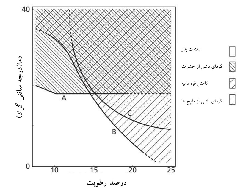 گرما و رطوبت باعث افزایش تنفس بذر میشود. نتیجه دیگر تنفس در بذر رطوبت است. گرما و رطوبت ناشی از افزایش تنفس میتواند از طریق انتقال گرما در توده بذر گسترش یافته و موجب تحریک فعالیت باکتری ها و آفات شده که به نوبه خود تنفس داشته و باعث افزایش گرما و رطوبت خواهند شد. بنابراین فرایند تولید گرما و رطوبت تبدیل به یک فرایند خود محرک و رو به ازدیاد خواهد شد. در چنین شرایطی با گرمای بیشتر فعالیت حشرات نیز افزایش مییابد. این مکانیسم های فساد همچنین میتوانند بر زنده ماندن بذر تاثیر گذاشته و قوه نامیه بذور را پایین آورده و آنرا غیر قابل فروش نماید. شکل 1 نشان می دهد که چگونه رابطه بین میزان رطوبت و دما بر قابلیت ذخیره سازی غلات تأثیر می گذارد. در شکل مشخص است که میزان رطوبت بذر در دماهای بالاتر باید کاهش یابد.
